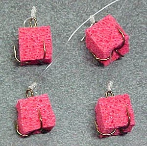 Made with extra strong size 6 VMC steel hooks. Tough rubber sponge is used so fish won’t tear them as easily as synthetic sponges. Pre-rigged with 20 lb. line and leader. Sponges measure 1/2″x1/2″ sq. Color Red 4 Rigs per package.